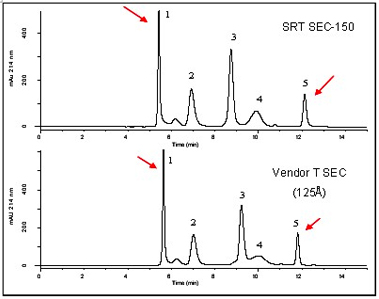 Sepax BR-C18柱使用的是被完全覆蓋的鍵合硅膠填料,因此即使在高pH環(huán)境下仍具有優(yōu)異的化學穩(wěn)定性。下圖是對測試化合物甲苯以55%乙腈-45%水(pH10)為流動相運行18,000倍柱體積后得到的結(jié)果,可見保留時間高度重現(xiàn)。如此高的穩(wěn)定性使Sepax BR-C18柱特別適用于許多分析物的確認。Sepax BR-C18獨有的化學鍵合技術(shù)使其具有高選擇性和高分離效率的特點。